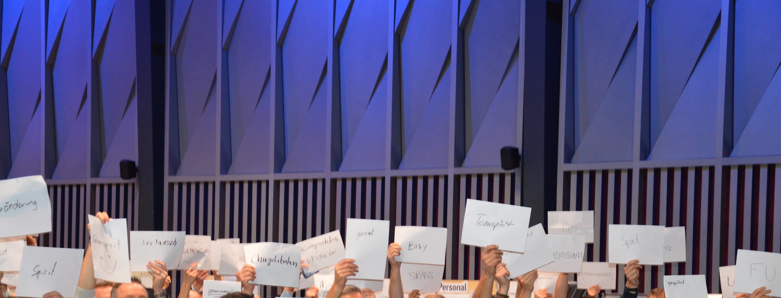 Die Strategiemesse fand an insgesamt zwei Tagen mit je ca. 230 Teilnehmenden statt. Die doppelte Durchführung ermöglichte allen Mitarbeitenden, an einem der zwei Tage am Event teilzunehmen. Wir übernahmen den Moderationslead für die Gesamtveranstaltung und waren auch für die Durchführung der einzelnen Workshopsettings verantwortlich. Bei der Gruppenzusammenstellung legten wir Wert darauf, dass sich die Gruppen den Tag durch immer wieder neu mischten. So entstanden vielfältige Begegnungen, die aufs gegenseitige Kennenlernen und das Wir-Gefühl als Gesamtunternehmen einzahlten.